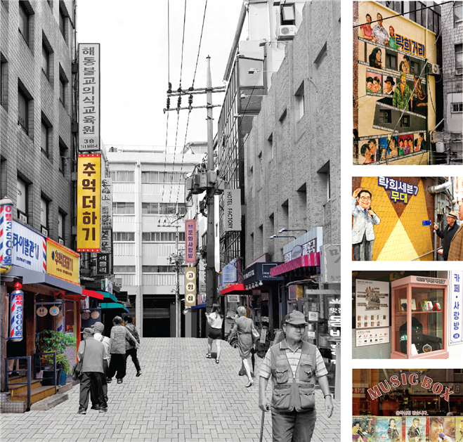 건물 벽에 60~70년대 유명했던 영화 장면들을 그린 ‘락희벽화’, 도로변 상점들의 옛 글자체를 살린 간판, ‘전국노래자랑’ MC 송해의 이미지를 재미있게 그린 작은 공연무대가 마련됐다.