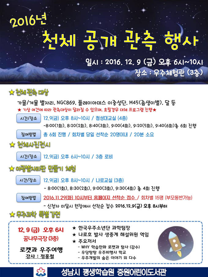 성남시 중원어린이도서관은 오는 12월 9일 도서관 4층 첨성대 교실에서 ‘천체 관측 행사’를 연다.