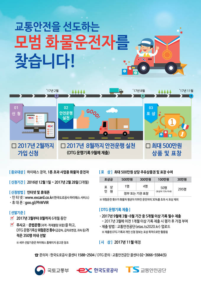 응모 자격은 하이패스 단말기를 장착한 1톤 초과 사업용 화물차 운전자이며한국도로공사 하이패스 서비스 홈페이지(www.excard.co.kr) 또는 휴대폰 (goo.gl/PhWVIR)으로 접속하여 가입 신청을 하면 된다.