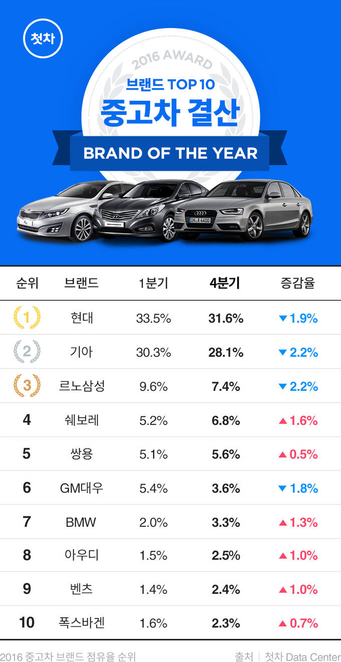 첫차 데이터센터의 2016년 브랜드별 중고차 판매 점유율을 살펴보면 작년 대비 브랜드 순위 변화는 없지만 판매 트렌드에는 확연한 차이가 있다. 꾸준히 판매 1, 2위를 차지하던 현대·기아차의 판매 점유율이 1.9%~2.2%씩 크게 하락하였고 BMW, 아우디, 벤츠 등 독일 브랜드 3개사는 최소 1.0% 이상씩 성장하고 있다.