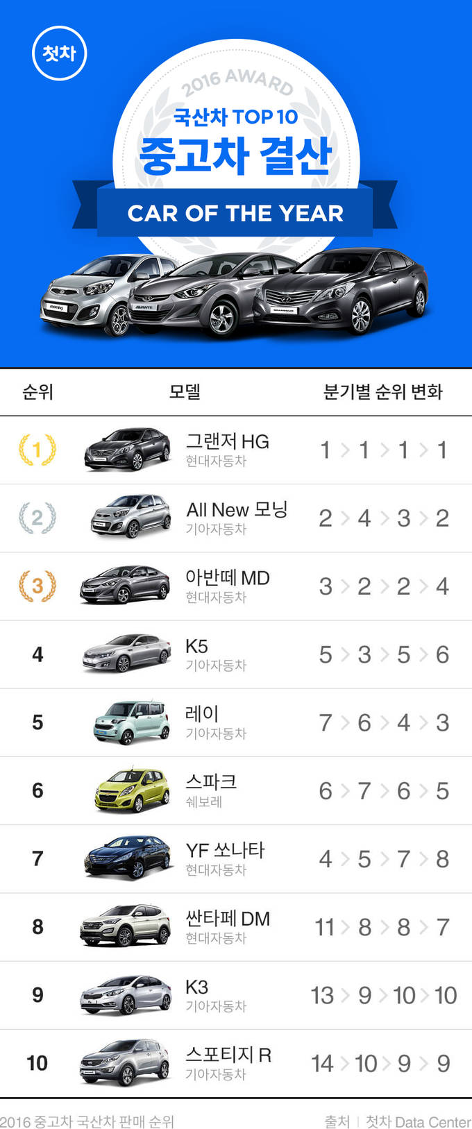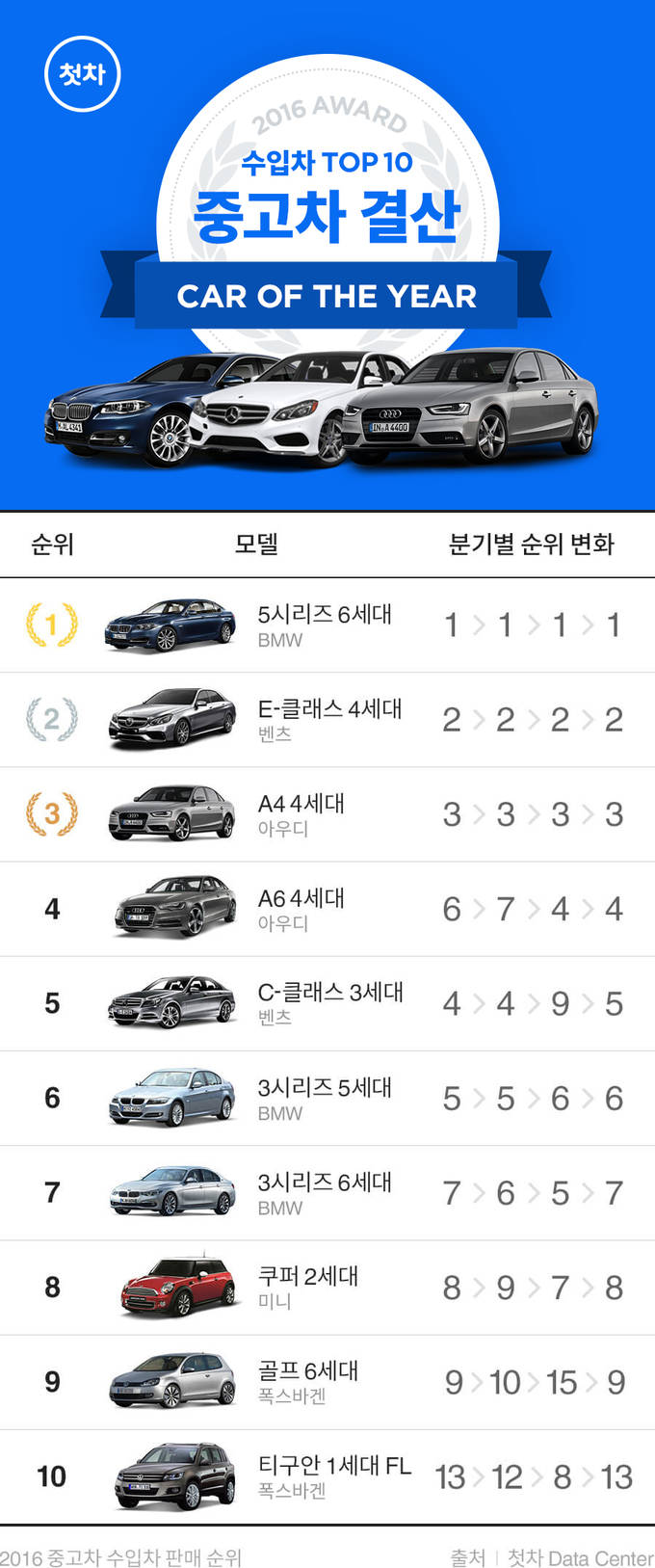 중고차 어플리케이션 첫차가 2016년 중고차 판매 트렌드와 국산, 수입차 판매 순위 자료를 발표했다.